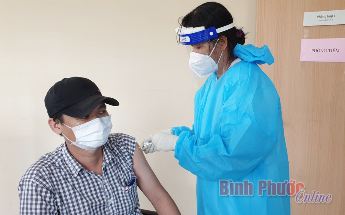 Buổi tiêm vắc xin cho công nhân các KCN ở huyện Chơn Thành trong sáng nay tại Công ty cổ phần gỗ MDF VRG Dongwha diễn ra an toàn. Dù số lượng người tiêm khá đông nhưng quá trình tiêm đều tuân thủ nghiêm ngặt các quy định, công tác an toàn tiêm chủng được đặc biệt chú ý.