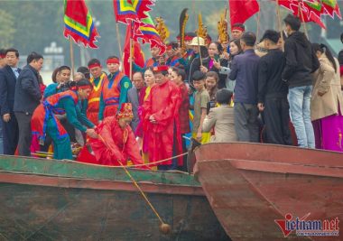 Sau khi múc nước xong thì đoàn thuyền quay ngược trở lại bến xuất phát và trang trọng khiêng nước vào đền thờ Vua Mai.