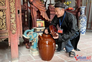 Ông Phan Bình Yên nằm trong tổ quản lý đền Vua Mai bên bình nước được múc từ sông Lam về hôm nay