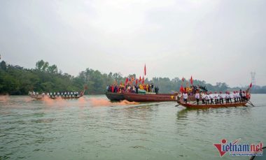 Pháo khói được thả trên sông và đoàn thuyền đi rước nước