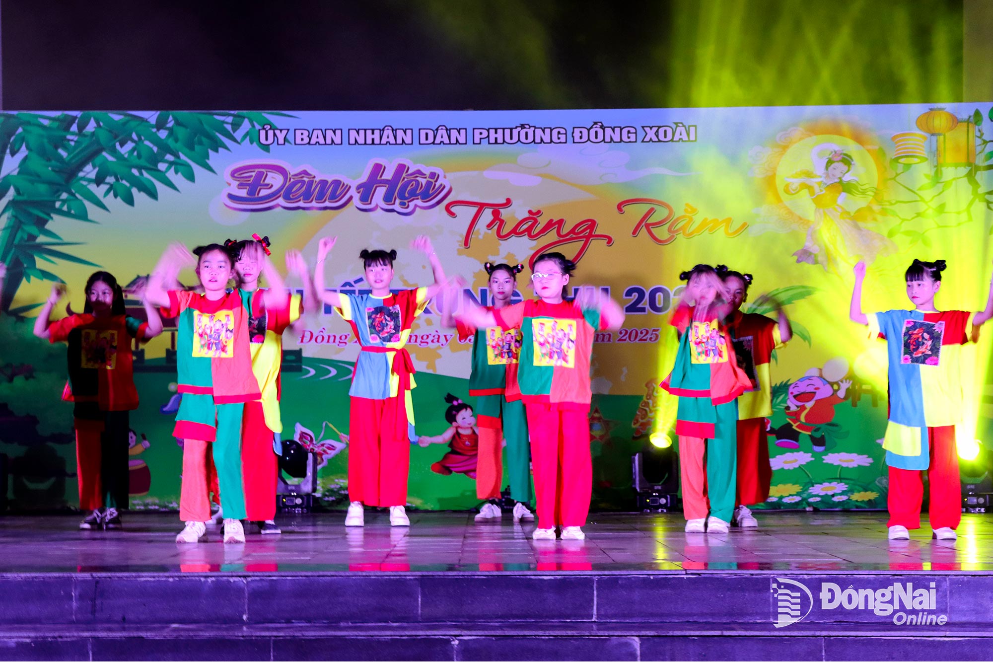 Đêm hội trăng rằm năm nay tại phường Đồng Xoài được tổ chức với chủ đề “Vui tết Trung thu năm 2025”, với nhiều tiết mục văn nghệ đặc sắc do chính các em thiếu nhi trên địa bàn phường biểu diễn. Những màn múa lân sôi động, những chiếc lồng đèn rực rỡ, cùng với mâm cỗ Trung thu truyền thống đã tạo nên không khí ấm áp, đậm đà bản sắc dân tộc.