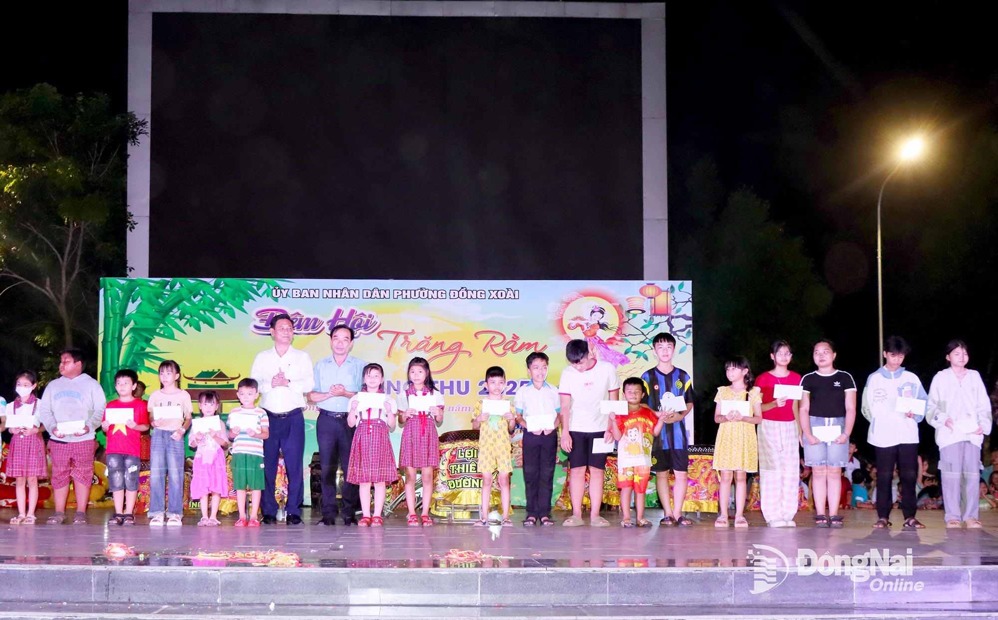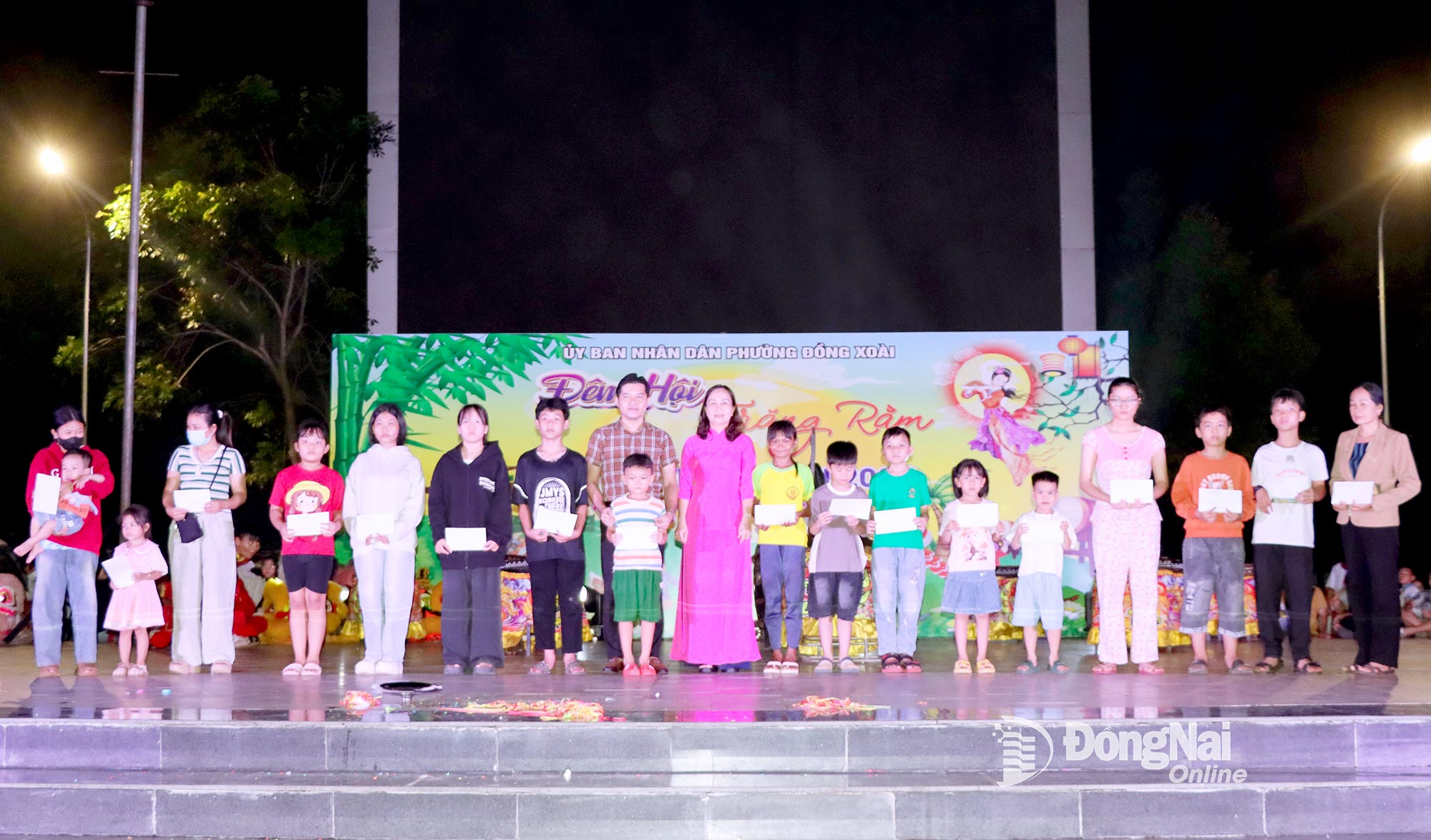 Lãnh đạo phường Đồng Xoài và các em thiếu nhi, người dân địa phương tham dự đêm hội trăng rằm. Ảnh: Thanh Mảng |