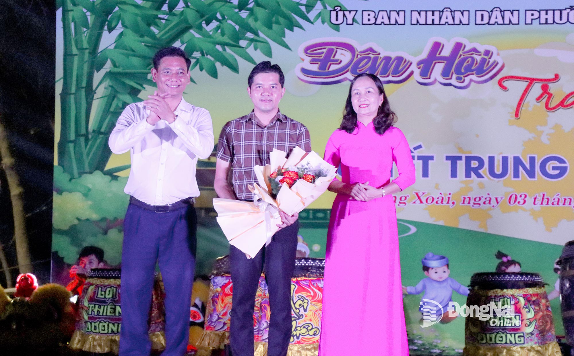 Lãnh đạo phường Đồng Xoài tặng hoa cảm ơn mạnh thường quân đã hỗ trợ quà cho các em thiếu nhi có hoàn cảnh khó khăn tại đêm hội. Ảnh: Thanh Mảng |