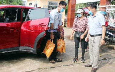 Lãnh đạo xã Tiến Hưng, thành phố Đồng Xoài trực tiếp tặng quà và thăm hỏi sức khỏe những người bán vé số, lang thang cơ nhỡ, người bán hàng rong không có công việc làm trong những ngày giãn cách xã hội