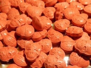 Các viên nén màu xám hình sọ người nghi là ma túy được giấu trong túi giấy bạc, cất giấu trong bưu phẩm gửi qua đường chuyển phát nhanh từ Hà Lan về Hà