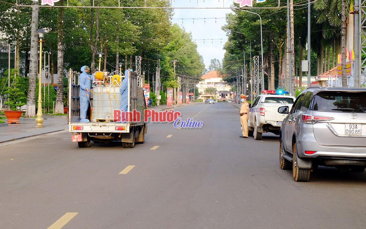 Ngay sau lễ ra quân, 5 xe phun khử khuẩn do Bộ chỉ huy Quân sự tỉnh hoán cải cùng 36 nhân viên y tế của trung tâm y tế huyện, thị xã, thành phố và Trung tâm kiểm soát bệnh tật (CDC) tỉnh đã phun xịt khu vực xung quanh trụ sở làm việc Tỉnh ủy, HĐND, UBND tỉnh, các tuyến đường Hùng Vương, Phú Riềng Đỏ, quốc lộ 14 thuộc thành phố Đồng Xoài. Dung dịch khử khuẩn được sử dụng là Cloramin B 25%.