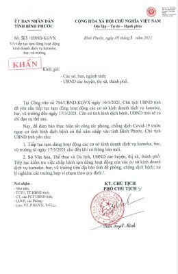 Ngày 17-3, UBND tỉnh Bình Phước đã ban hành Công văn khẩn số 863/UBND-KGVX về việc tiếp tục tạm dừng dịch vụ karaoke, bar, vũ trường.
