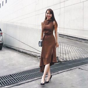 Khi đi làm, Trúc Mai giản dị với những bộ đầm công sở.