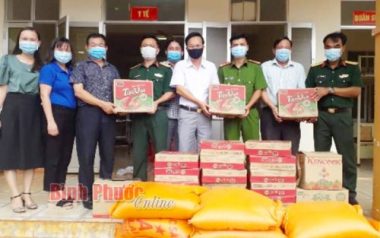 Đại tá Bùi Phó Vĩnh cùng đại diện Khối vận huyện Bù Gia Mập tặng quà khu cách ly Trường Dân tộc nội trú huyện