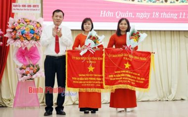 Phó Chủ tịch UBND huyện Nguyễn Văn Hạ trao cờ thi đua của UBND tỉnh cho Trường THCS Đồng Nơ và Tiểu học Tân Khai B