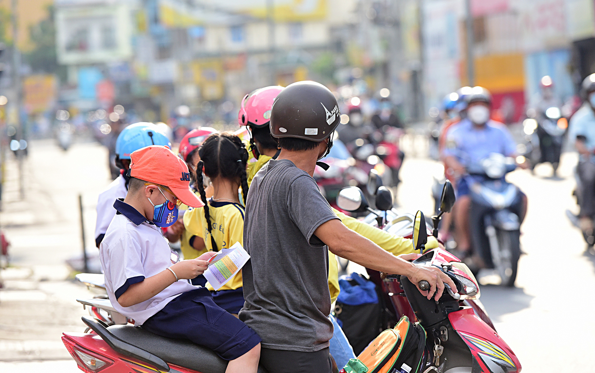 Phụ huynh luôn quan tâm đưa đón các em học sinh tiểu học khi tan trường (quận Bình Thạnh, TP.HCM)