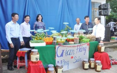 Các lãnh đạo tỉnh và địa phương tham quan gian hàng đặc sản xã Hưng Phước