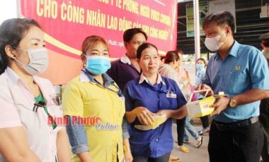 Công đoàn KCN khu vực Đồng Xoài và Đồng Phú phối hợp Phòng khám đa khoa Tâm Đức (Đồng Xoài), Đồn công an Bắc Đồng Phú phát miễn phí 6.000 chiếc khẩu trang y tế cho công nhân KCN Bắc Đồng Phú