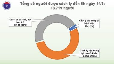 Về vấn đề cách ly, tính đến 6 ngày 14-5, hiện tổng số người tiếp xúc gần và nhập cảnh từ vùng dịch đang được theo dõi sức khỏe (cách ly) là 13.719 người, trong đó có 324 người cách ly tập trung tại bệnh viện, 7.254 người cách ly tập trung tại cơ sở khác và 6.141 người cách ly tại nhà, nơi lưu trú.