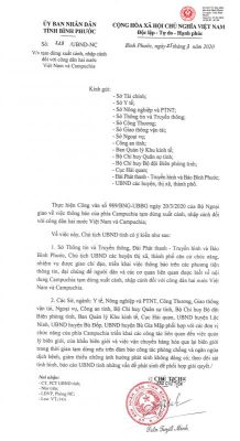Trước đó, ngày 20-3, Bộ Ngoại giao đã ban hành Công văn số 989/BNG-UBBG về thông báo của phía Campuchia tạm người xuất cảnh, nhập cảnh đối với công dân hai nước Việt Nam và Campuchia. Do đó, Chủ tịch UBND tỉnh đề nghị Sở Thông tin