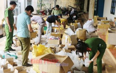 Công an TP. Đồng Xoài phối hợp với lực lượng quản lý thị trường tỉnh Bình Phước tiến hành kiểm đếm số hàng hóa