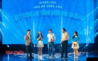 Thảo My (thứ 4 từ trái sang) chụp hình lưu niệm cùng ê-kíp thực hiện chương trình “Vườn hoa âm nhạc tuổi thơ” tại sóc Ông La, xã Thống Nhất, huyện Bù Đăng