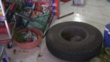 Chiếc xe tải đang lưu thông bất ngờ bánh sau xe phát nổ, một bánh xe bị văng ra ngoài, lao vào quán tạp hóa bên đường khiến chủ quán bị thương, nhiều người đang có mặt trong quán được một phen hoảng hốt.