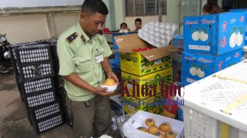 Nhân viên đội QLTT thị xã kiểm tra các thùng trái cây thu giữ