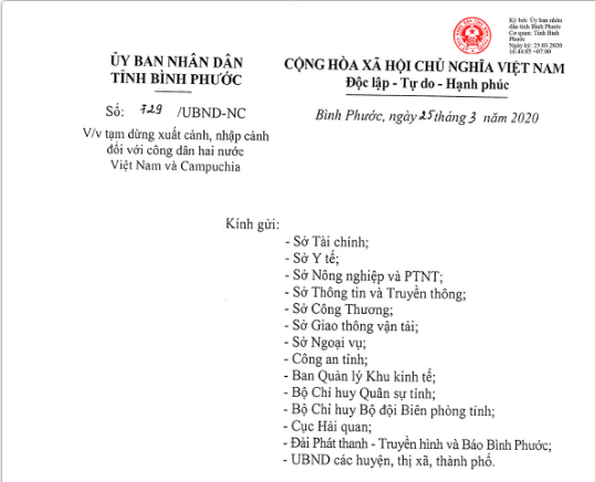 Hôm qua, 25-3, UBND tỉnh đã ban hành Công văn số 729/UBND-NC về việc tạm dừng xuất cảnh, nhập cảnh đối với công dân hai nước Việt Nam và Campuchia. Trước đó, ngày 20-3, Bộ Ngoại giao đã ban hành Công ...