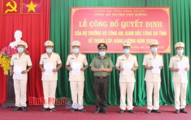 Sáng nay 14-6, Công an huyện Phú Riềng tổ chức lễ công bố và trao quyết định thăng quân hàm, nâng bậc lương năm 2021. Lãnh đạo Công an huyện Phú Riềng trao quyết định thăng cấp bậc hàm, nâng bậc lương...