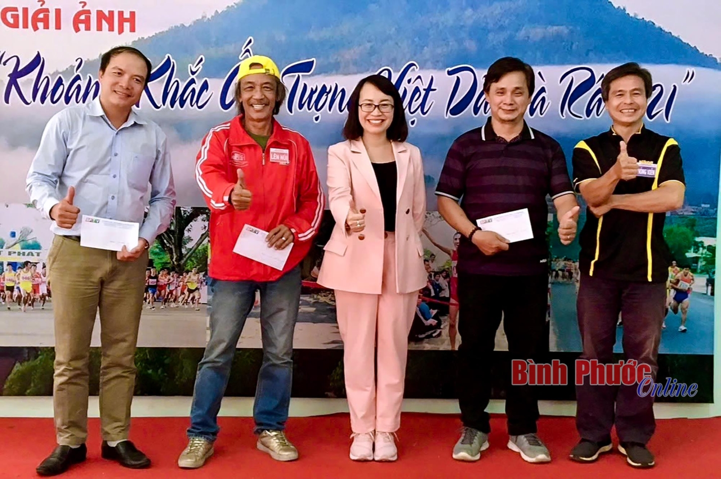 Giám đốc – Tổng Biên tập BPTV Nguyễn Thị Minh Nhâm trao giải Ảnh xuất sắc cho tác giả Dư Hải (thứ hai từ trái sang) tại Giải ảnh Việt dã Bà Rá năm 2021