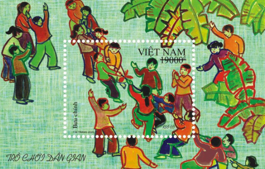 4 mẫu tem thể hiện 4 trò chơi dân gian phổ biến của Việt Nam là ô ăn quan, nhảy dây, rồng rắn lên mây và bịt mắt bắt dê. Trên blốc là trò chơi kéo