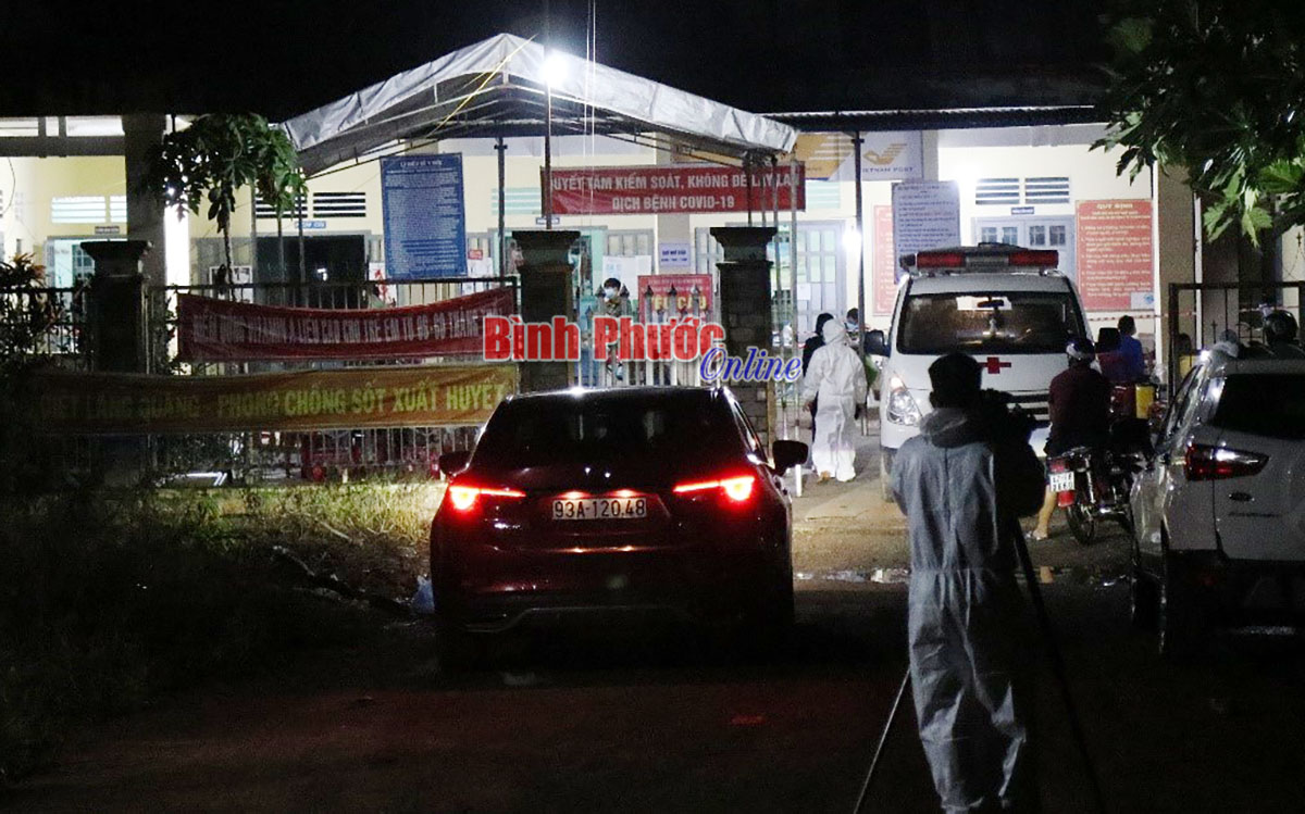 Tại trạm y tế xã Minh Thành, lực lượng chức năng đưa các trường hợp F1 đi cách ly tập trung ngay trong đêm. Ảnh chụp lúc 2 giờ sáng ngày 9-7-2021.